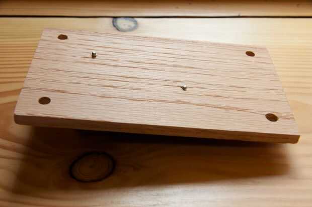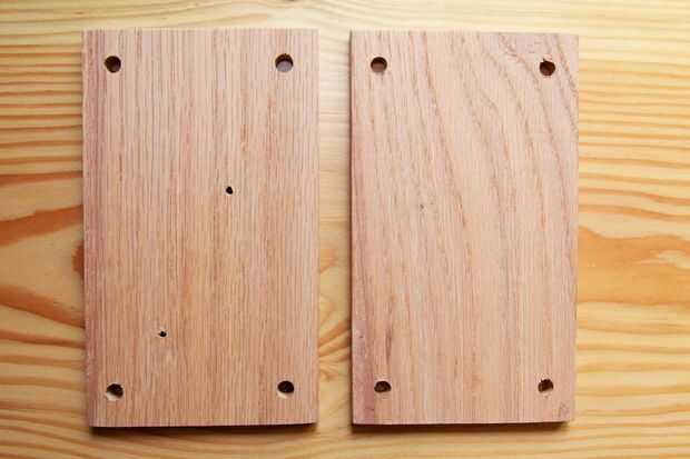 14) una vez que ha hecho esto, coloque cuidadosamente el abajo en la pieza de roble con los agujeros más pequeños. El resultado debería verse como la foto #4.