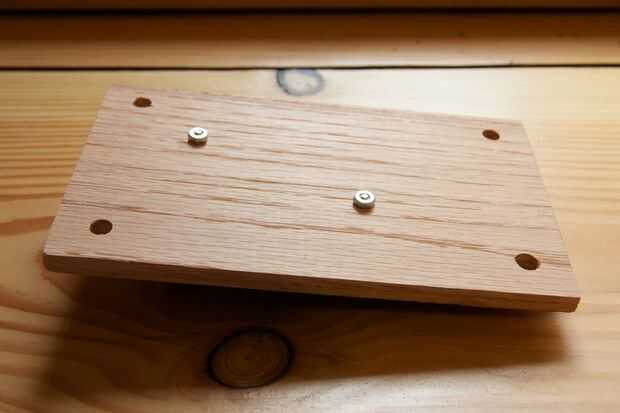 15) a los bancos esa pieza, usted debe ver los extremos de los tornillos sobresaliendo (cuadro #5). Tomar dos más #4 tuercas y tornillo de la pi en la placa de roble (cuadro #6).