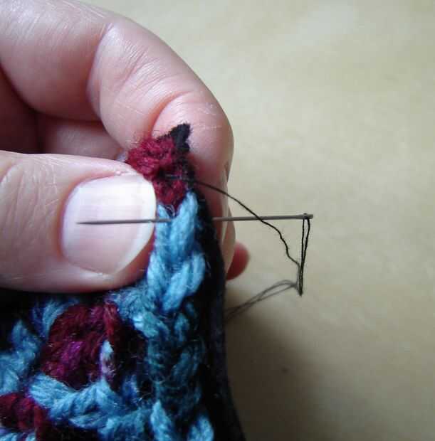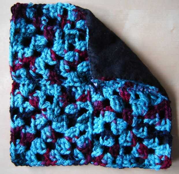 Ponga el cuadrado de ganchillo encima de la línea y ellos juntos a partir de las esquinas y que se extiende la negra cuadrado con los bordes.  Mano coser las dos telas juntas usando una puntada del azote.
