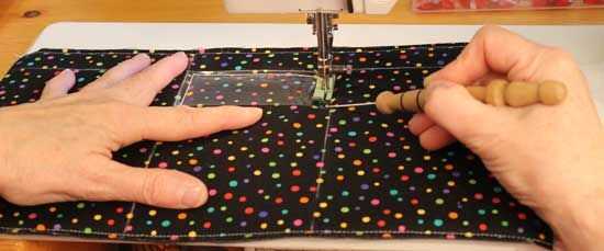 2. coser en el lugar alrededor de los bordes inferiores y laterales, costuras ⅛"desde el borde. No coser el borde superior del bolsillo.