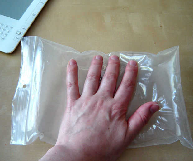 • Encontrar una bolsa de ziplock en la que se ajuste su lector de libros electrónicos. Puede utilizar una bolsa de congelador grande y plegar el exceso.