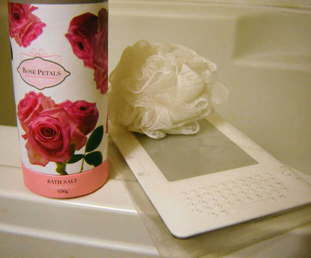 me encanta la lectura en la bañera (especialmente con una buena copa de vino).  Cuando empecé a leer más libros en mi Kindle, pensé que tendría que renunciar a leer en la bañera, teniendo en cuenta que una vez había caído un libro de tapa dura en la bañera.  Sin embargo, hay una solución simple, una bolsa de ziplock.