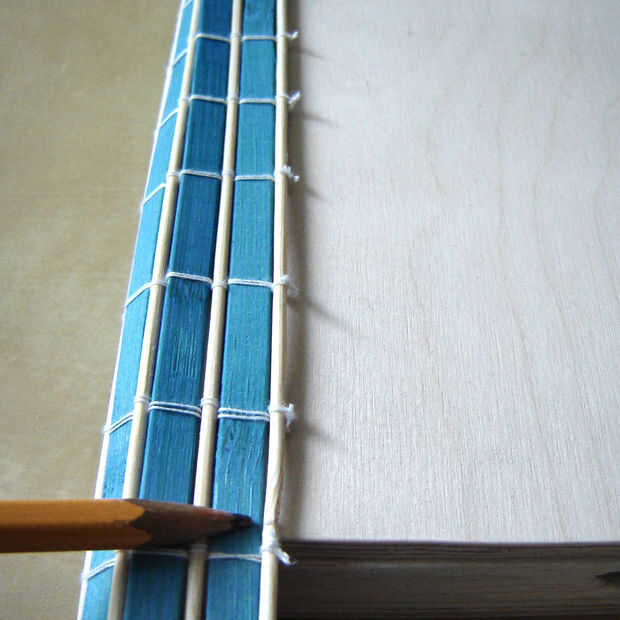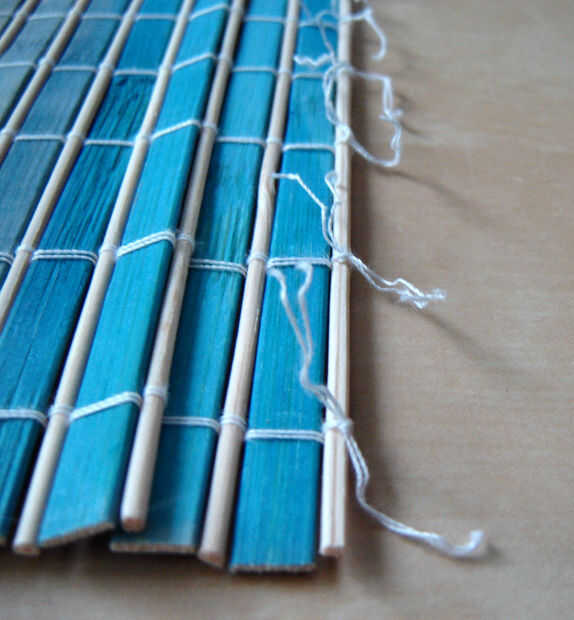 quería ser capaz de mover de un tirón la portada por lo que necesitaba una manera de conectar las dos piezas de madera contrachapada que era bastante flexible.  Pensé acerca del uso de cuero o tela, pero luego vio mi mantel de bambú y pensó que sería perfecto.  Mi ropa ya se pinta un agradable color azul, si tuyo es el color natural puede pintarlos con pintura de agua color.