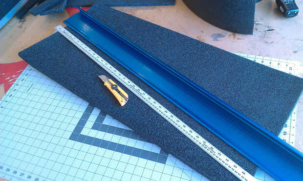 Usando la espuma de 1/2", la línea interior de la caja, a partir de la parte inferior. Medición de las piezas laterales, asegúrese de que la espuma es un poco más corta que la pared de la caja de modo que se cierra completamente.