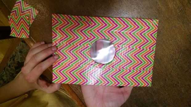 Cortar un cuadrado del protector de la hoja lo bastante grande como para cubrir el círculo completo. Esa plaza en el interior de la caja de cereales, que cubren el círculo de la cinta.