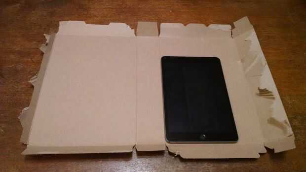 Poner el iPad en el lado derecho de la caja de cereal. Alinee con la esquina inferior izquierda de ese lado.
