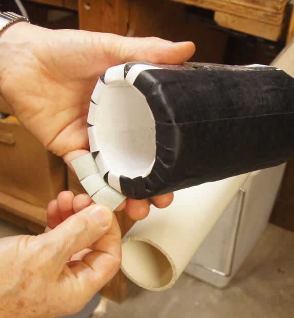 En la parte superior, cortar cada tira en tres pestañas que no llegan bien a la superficie interna del tubo.