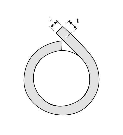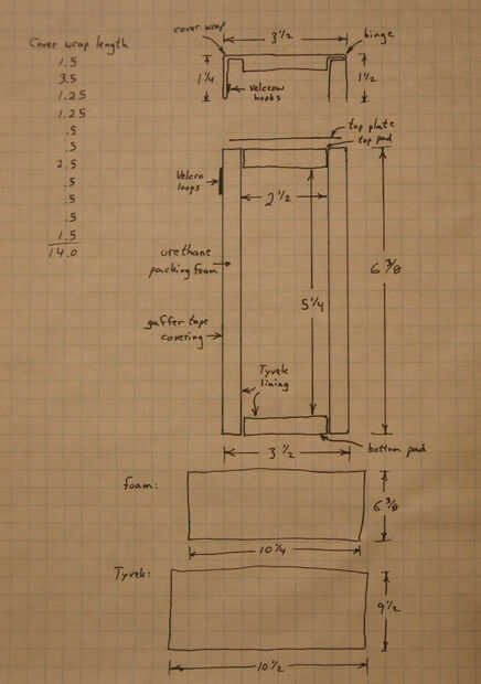 Dibujar un croquis con las dimensiones. Sugiero una mitad de pulgada de espesor de la espuma, pero puede ajustar dependiendo de cuánto espacio que tienes y cuánta protección usted cree que necesitan. La duración de la espuma necesaria para envolver alrededor de la lente depende de la circunferencia efectiva. Te sugiero cortar la espuma un poco más larga y corte como se muestra en la siguiente figura. Las cuentas de la longitud adicional (un poco más que el espesor de la espuma) para dos efectos: primero, en el cilindro final la superficie interna entera de la espuma es por compresión, mientras que para esto envuelve forma parte de la espuma es recta, y por esa parte la superficie interna es relajada. En segundo lugar, están aplicando presión para obtener la espuma para conformarse con el mandril, que queremos el cilindro final sólo tocarlo sin aplicar ningún tipo de presión. Usted puede cortar una tira estrecha de la prueba (de un una pulgada "tubo largo") y compruebe que sólo se desliza sobre la guarnición de Tyvek. El revestimiento debe ser aproximadamente tres pulgadas de más y una media pulgada más largo que la espuma.