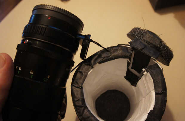 Si tu lente tiene un trípode de montaje pie, entonces en este punto en la Asamblea, puede cortar una ranura de alivio en el forro y la espuma, luego un parche de polietileno de la cinta en el exterior donde usted puede sujetar la tapa. (Esta caja tiene una tapa sencilla que no he actualizado aún al más reciente diseño.