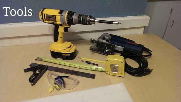 Taladro, con Phillips y brocas de mostrador fregadero, jigsaw con lámina de madera, cinta métrica, Plaza, lápiz y equipo de seguridad.