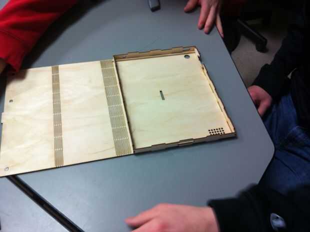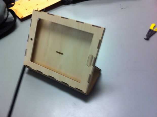 este caso de iPad de madera fue diseñado para montar y sostener un Ipad 2, así como almacenar papel de en-por - 11 en 8.5 en el compartimento inferior. Se incluyeron también el espacio para un portapapeles para fijarse a la parte posterior.Costo: alr