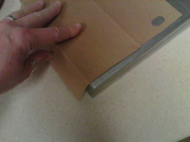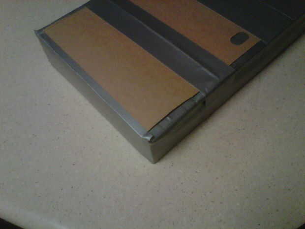 Decidir cual es la parte de atrás y que es la parte delantera. Corte un pedazo de cartón delgado para cubrir el fondo y (sobre) la parte posterior de su caso. Cinta adhesiva en su posición con dos o tres trozos cortos de cinta. Esto es para refuerzo y rigidez.