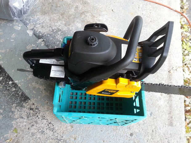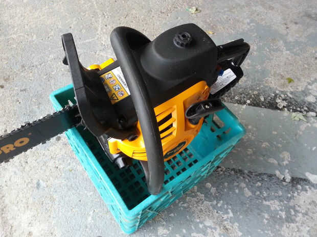 Este paso dependerá el tamaño y la forma de su motosierra particular. Un cajón de leche debería funcionar para casi todo, independientemente de la longitud de la barra. Si su caja tiene "manijas" me pareció más conveniente para mantenerlos en los lados.