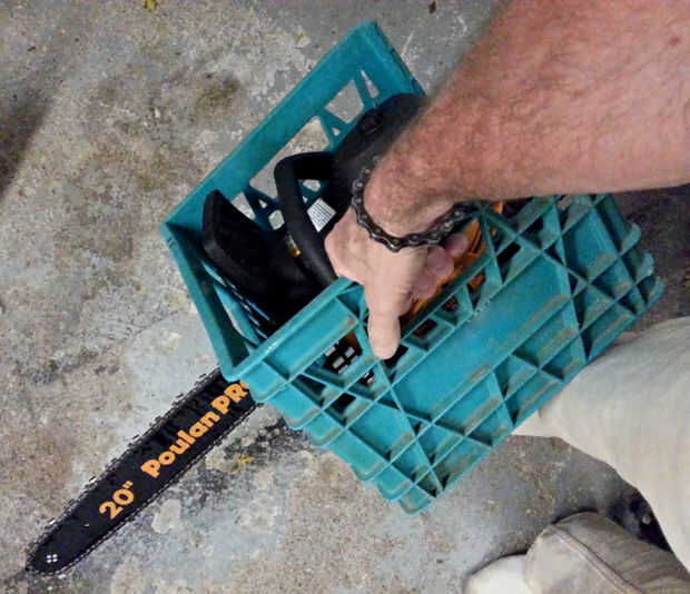 Y ahí lo tienen. Habitación para una motosierra y todos los accesorios. Encontrar el cajón cargado naturalmente se inclina hacia delante cuando recojo así que no hay que preocuparse por las cosas deslizarse hacia la parte posterior. Se podría agregar una cuerda del amortiguador auxiliar para mayor seguridad. (¡ Gracias "Jobar007".)