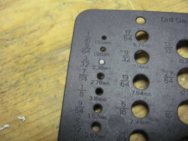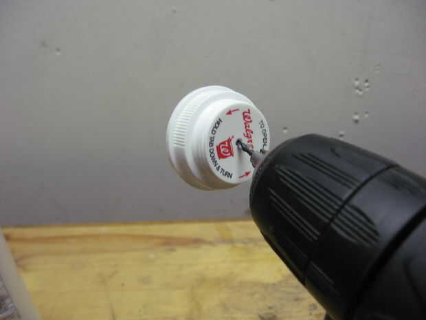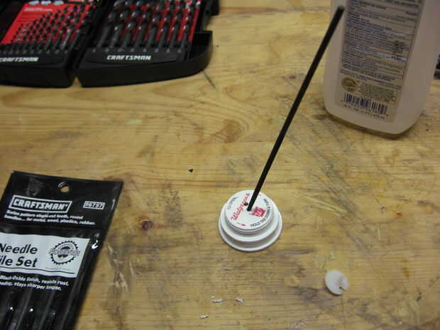 Primero saque la tapa de la botella y elija donde desea que el eje pase a través. Determinar el diámetro del husillo con el calibrador de pedacito de taladro. Mi eje no corrspond exactamente a un tamaño de pedacito de taladro estándar, así que elegí un poco que era ligeramente más pequeño que el eje. Luego utilicé un pequeño archivo para ampliar poco a poco el agujero, hasta que el eje podría caber a través y girar libremente. Recomiendo usar este método incluso si su eje se corresponde con un tamaño de pedacito de taladro estándar. Este método le permitirá hacer el orificio ya mencionado de Ricitos de oro.