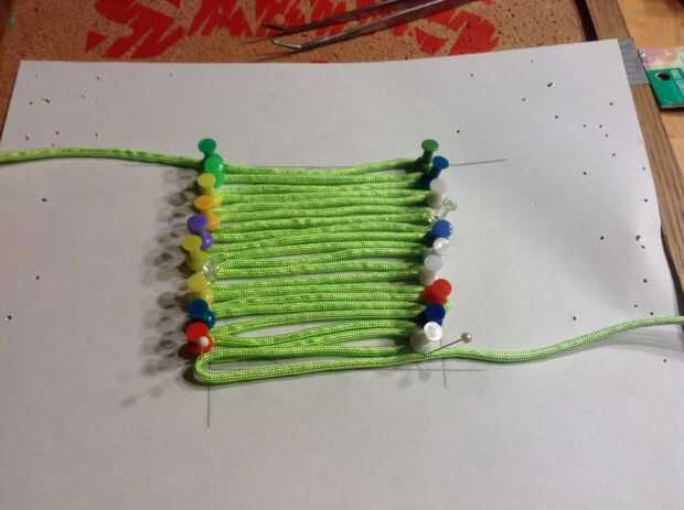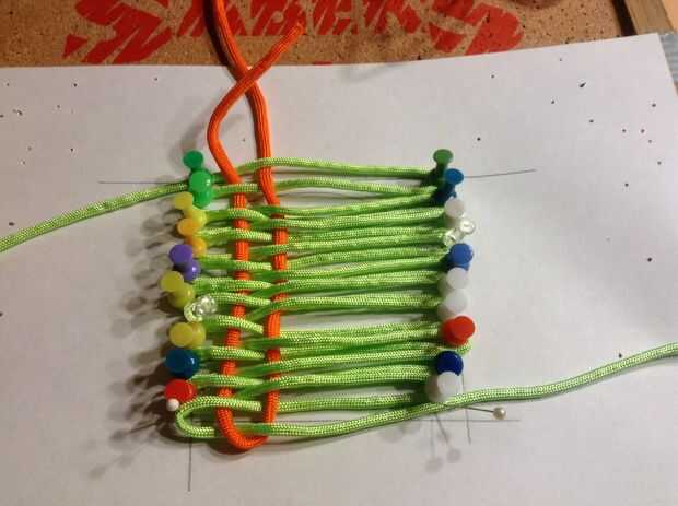 Tomando su color primario ir y hacia atrás sobre su dibujo 10 veces colocar un alfiler en cada vuelta. Luego tome su color secundario y a través de la armadura. Asegúrese de dejar aproximadamente 2 pulgadas adicionales de la cuerda en los extremos iniciales.
