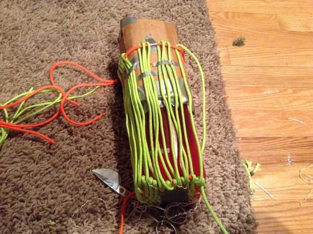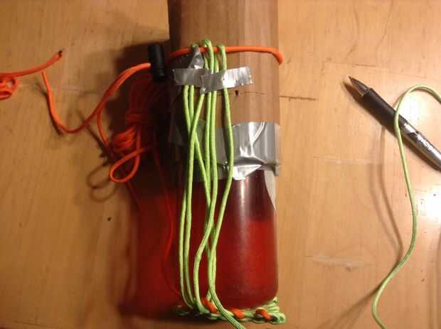 esto es importante y hará que usted dolores de cabeza más adelante si no sigue este!! Comienzo desde la parte inferior con su exceso de la base de los colores primarios al llegar a la cuerda superior bajar bajo y sobre la cinta con cinta adhesiva mientras avanzas para que tu primera cadena que grabado abajo es la cuerda que va hacia arriba y el segundo es el bajar una. Al llegar a la parte inferior otra vez ir de adentro hacia afuera y sobre el bucle. Repetir 24 veces como usted se mueve alrededor de la botella. Sacar las cuerdas de marcador como vas. Asegúrese de que su última cadena termina la parte superior si no tienes un número par de cadenas.
