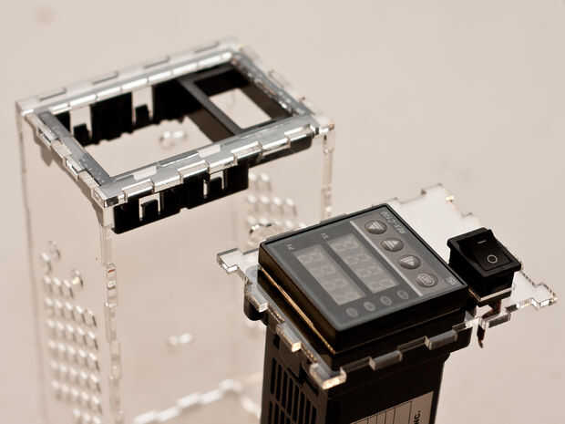Mientras tanto el pegamento obtener seco, coloque el termostato en el agujero más grande delantero y cerradura con la cerradura adecuada. El pequeño interruptor tiene que fijarse en el agujero pequeño pero luego es difícil quitar, así que hacerlo sólo si vas montar terminales faston en los cables.