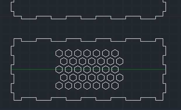 Autocad puede decidir hacer una red mucho más agradable que algunos líneas simples. Así que quería hacer muchos agujeros hexagonales para formar dos cuadrículas rectangulares para la ventilación del dispositivo. Las rejillas están en las superficies superior e inferior de la caja.