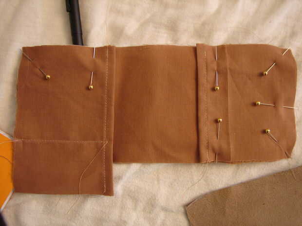 No se olvide de este paso! Clip grande bolsillo pieza a uno de los rectángulos grandes (esto será la parte interior) y coser la una línea horizontal en el medio algo de la pieza con el lado equivocado del bolsillo en el lado derecho del rectángulo grande. Tirar de sus hilos a través de al lado inferior del rectángulo grande y atar apagado. Nota, algunos de los materiales de bolsillo se cuelgue sobre el borde del rectángulo, esto es aceptable, se convierte en la ranura de la pluma.