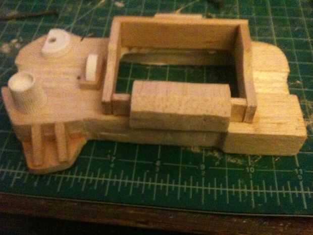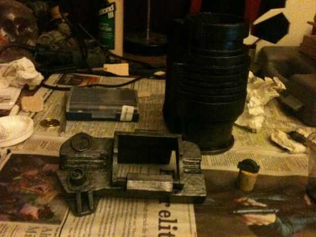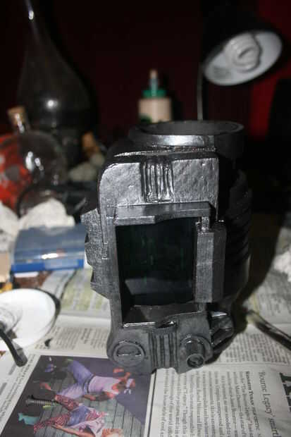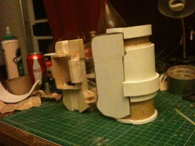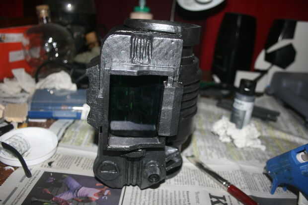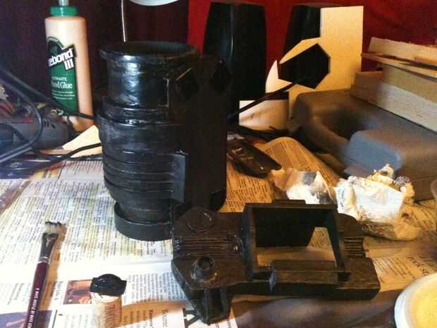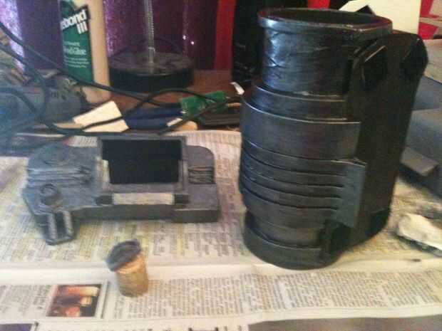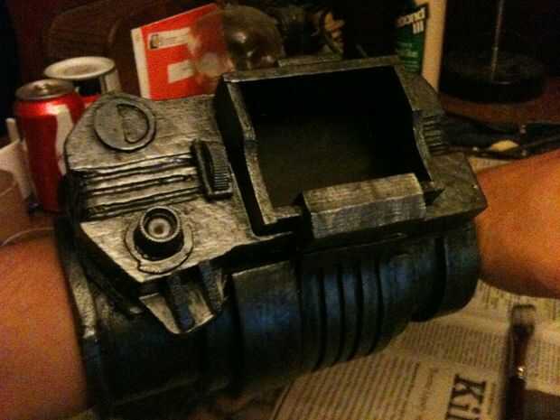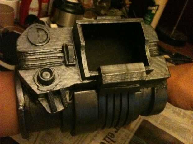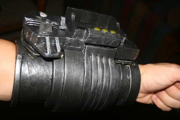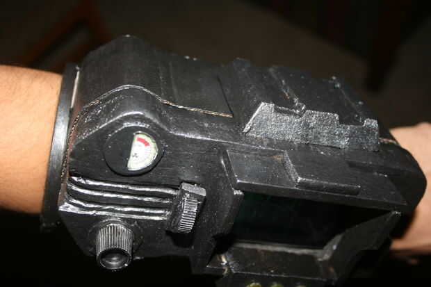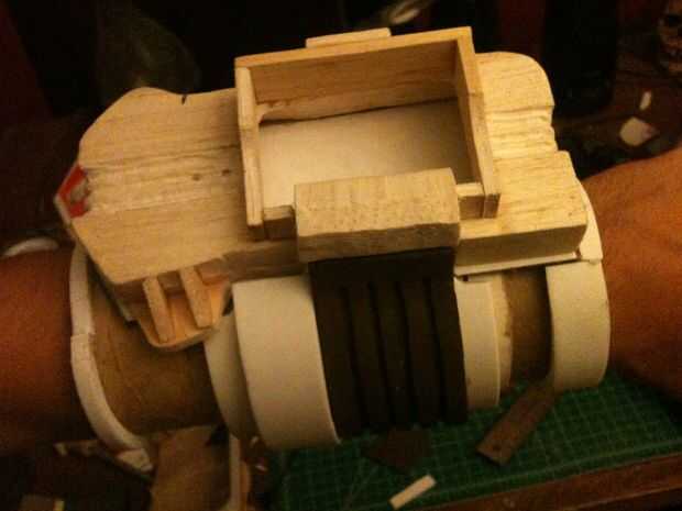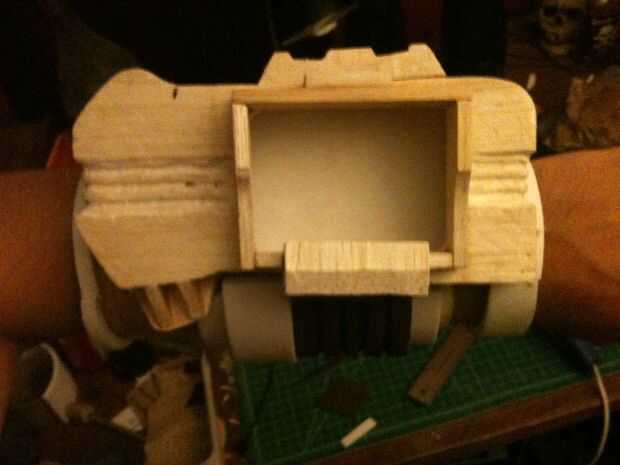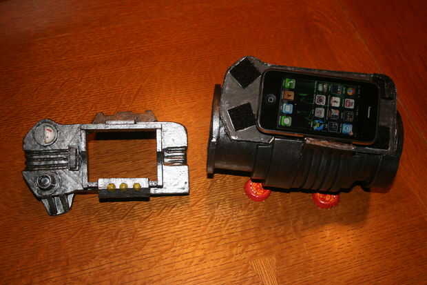 Empecé con la talla un bloque de madera de balsa en una forma básica con mi Dremel, talla y pegado en detalles hasta que parecía cerca de lo se ve en el juego. El dial de canal es una tapa de pasta de dientes, y los botones y luces en la parte inferior de la pantalla eran golpes de plástico cortadas de la parte inferior de botellas de la medicina. La banda de brazo es un gran tubo de cartón con espuma de arte envuelto alrededor de él de forma. No abren, pero soy capaz de poner mi brazo en fácilmente con lo accesorio todavía perfectamente. Una base de cartón con velcro conecta el rostro de madera de balsa con el resto y permite una forma de insertar mi smartphone. La espuma fue sellada con pegamento de Elmer y la madera con un sello de madera spray que he encontrado en el garaje antes de pintado y soportó todo con acrílicos.