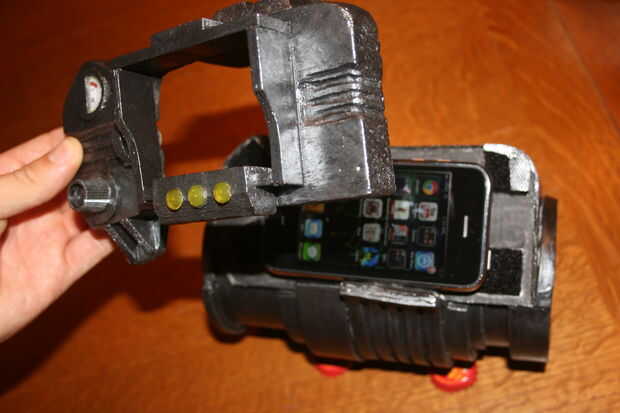 Este apoyo fue construido fuera de un tubo de cartón grande, arte de madera espuma y balsa con un iPhone a una pantalla. La rueda de desplazamiento hacia la izquierda de la pantalla es realmente un botón rudimentario sobre el botón home del iPhone, permitiendo cerca de completo acceso a las diferentes funciones del teléfono. Si mi grabación de Galaxy News Radio es interrumpida por una llamada telefónica, yo debería ser capaz de navegar a altavoz y sin problema.