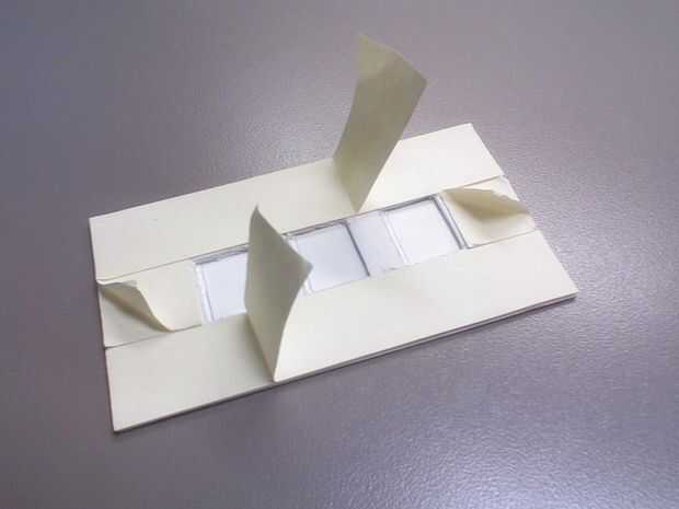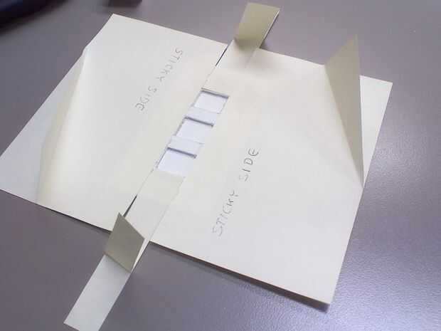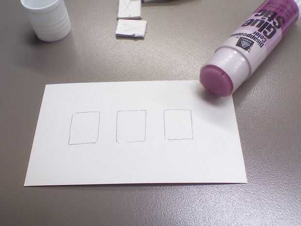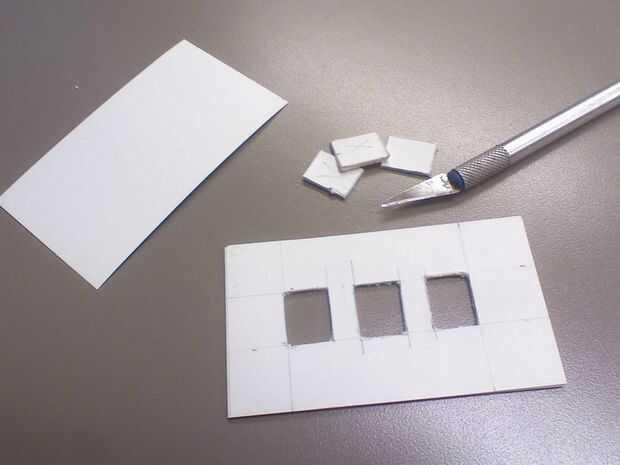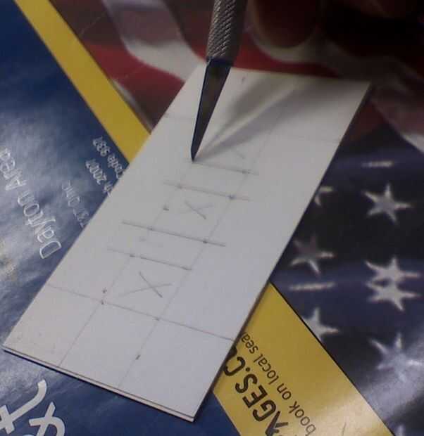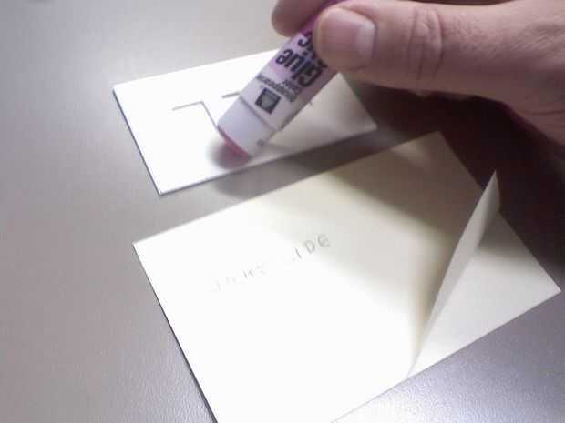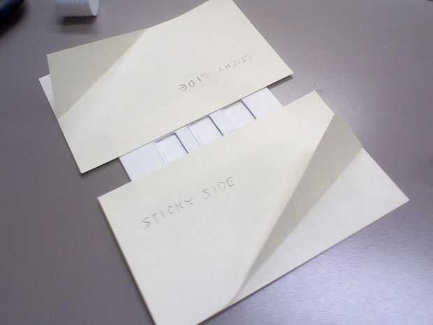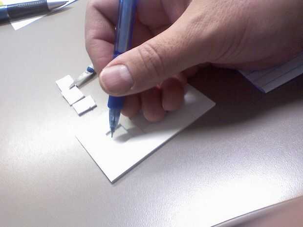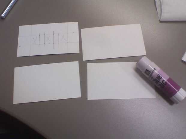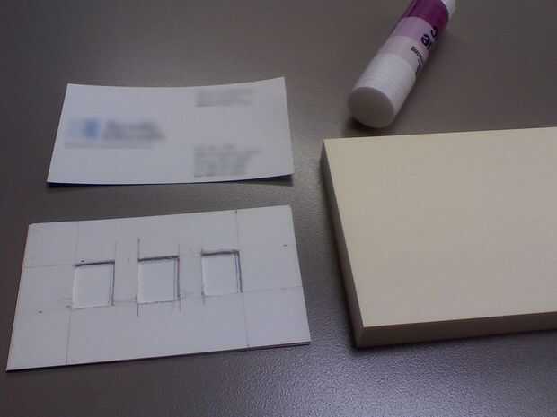 Lista de materiales es 6 tarjetas de visita, notas adhesivas, pegamento y un cuchillo de la manía (mina era muy aburrida).