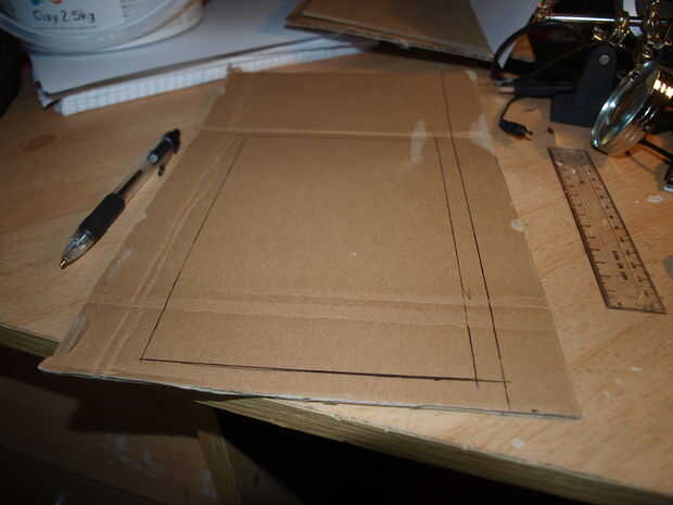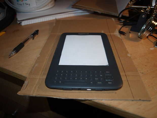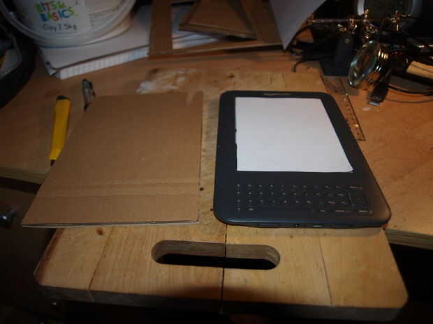 El paso más fácil, primero encontré las dimensiones de la kindle, según búsquedas en línea, y encontré estos que 7,5 "x 4,8" x 0.40 ", esto facilita mi primer trabajo, un simple rectángulo de cartón medir 7,5" x 4,8", corte más en vez de menos si no eres exacta con un cuchillo del corte.