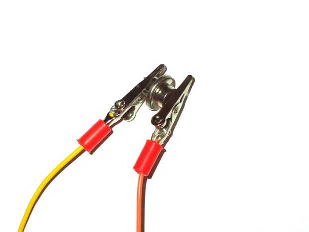 Los LEDs baratos, pedí no tenían la polaridad marcada, por lo que he probado el LED con una pila de monedas. Está conectado a los cables de prueba con los imanes. Luego marqué el cátodo con un marcador.