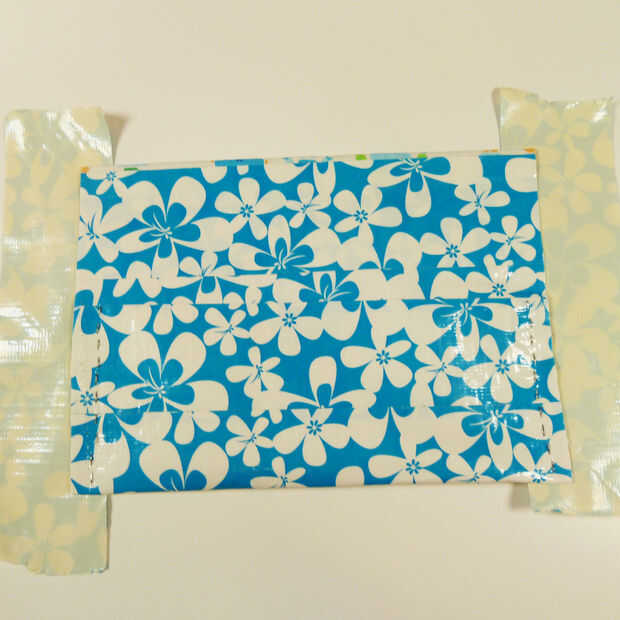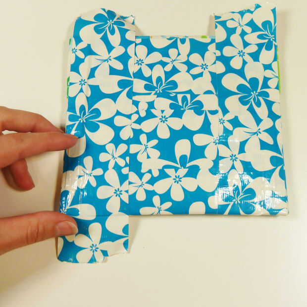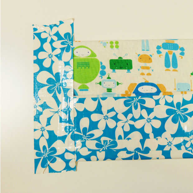 Doblar los bordes con cinta sobre a lo largo de la línea de grapas por lo que son plegables atrás aproximadamente 1/2" de la tela y la cinta hacia abajo.