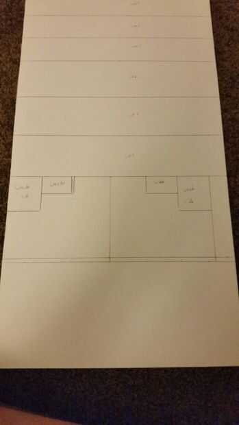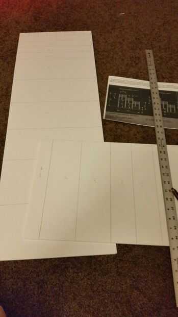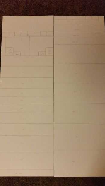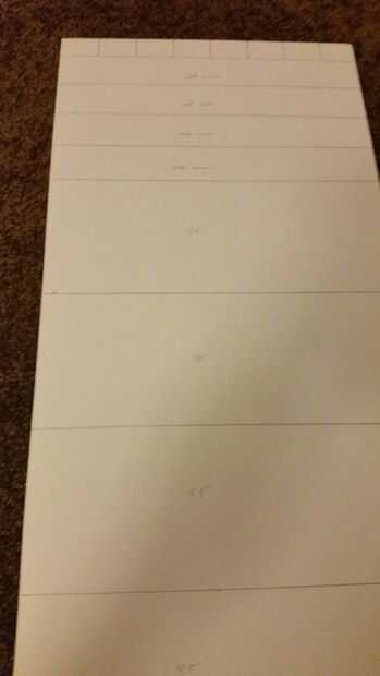 Una medición me di cuenta de a la izquierda del diagrama pero escribió sobre están las ranuras para los separadores. Construí este portatarjetas con 0,75" espacio para la cubierta y 0.5" de espacio de Descartes. Así, para cada uno de los 15 separadores cortados una ligeramente menor que 0,25" de ancho y 0.5" profunda hendidura. Un poco más pequeña por lo que la pieza se sujete y no flop alrededor en la muesca de la cubierta/descarte separador.