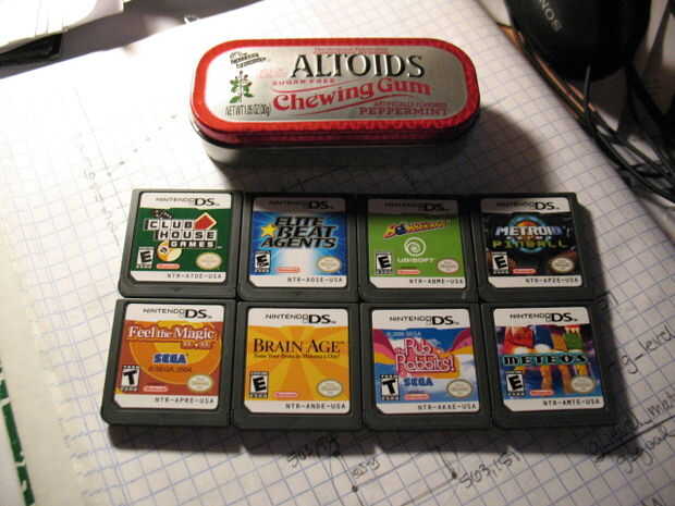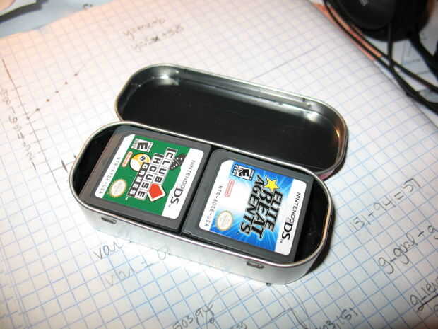 Uno caben hasta ocho juegos en una lata, o cuatro juegos y el plástico de la cubren para el slot-2 en la DS Lite.