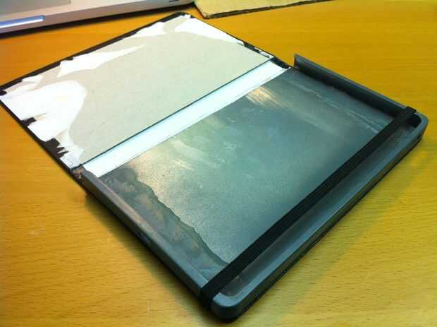 Quieres tener una tira a lo largo del borde interior de la caja con los agujeros para los puertos / botones y 3 muy finas tiras para pasar por debajo de la luneta. Siempre querrás tener cuidado cuando usted inserte el nook en el caso, pero estas tiras le dan un poco a prueba de arañazos. Para unir la caja de aluminio para la contraportada de la Moleskine sólo utiliza abrazaderas de resina epoxi y primavera / pesos, sólo asegúrese de que eres cuidadoso posicionamiento de la caja y mirar hacia fuera para cualquier extra epoxy exprime hacia fuera.