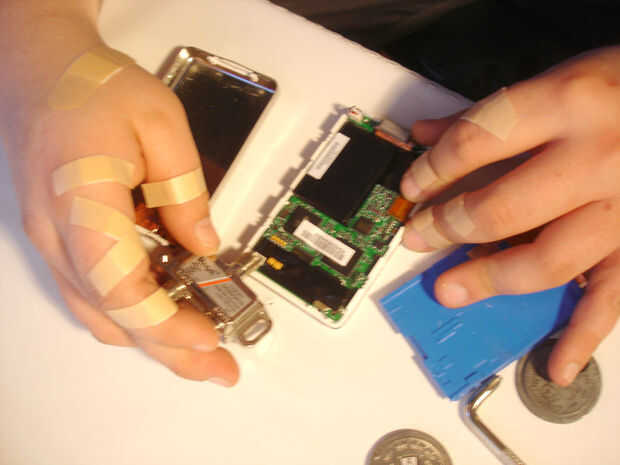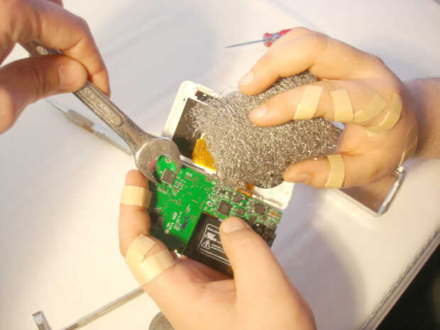 Cuidadosamente quitar placas de circuito impreso, batería, disco duro, circuitos integrados, fusibles, pantalla y el condensador grande. Usted necesitará de losen los chips individuales con una llave de combinación de 5/8 de pulgada como en la imagen. Utilizar la lana de acero para un cortocircuito y descargar la batería de su Ipod para que tú y tu gato no se lesionan.