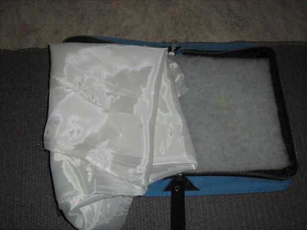 Así se dio un paso más en la forma de una hoja de seda artificial que fue ahí en la casa. Así que lo hizo cortar un trozo de ella y pegados por los lados de la espuma.