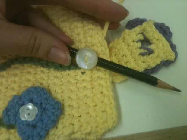 Por último pero no menos importante, coloque el botón de cierre. Porque el agujero de botón de flor es relativamente grueso, usé hilo para sujetar el botón, deslizando un lápiz entre el botón y el caso mientras que atando para que el botón no sería plano contra el caso - si fuese plana contra el caso, no sería capaz de ir a través del agujero de botón grueso.