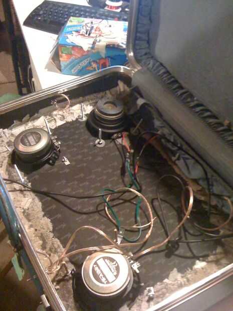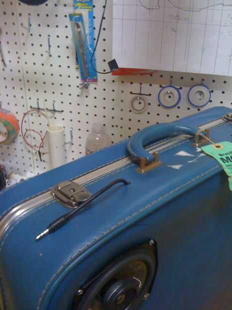 Alambré encima de la batería al otro lado del interruptor de encendido/apagado, y me hizo un enchufe para entrar en el amplificador del altavoz de pc había conectado.