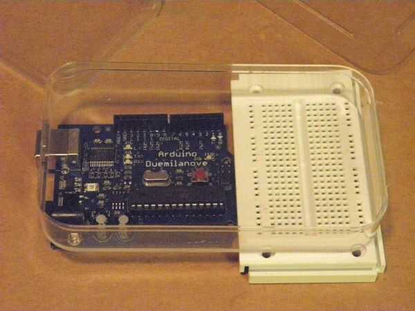 Me puso la placa Arduino junto a la placa y coloca el caso de iPod en la parte superior para tener una idea de cuánto corte tendría que hacer. Por suerte, la placa Arduino realmente no necesita ninguna modificación. El protoboard, por otro lado, necesita alguna cirugía. Para obtener las medidas justas, tuve que cortar las aberturas para la USB y energía en el caso y colocar la placa de Arduino en allí.