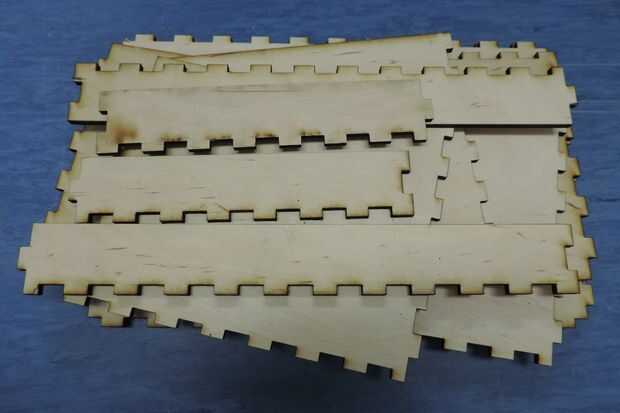 Nota: Si quieres decorar la caja con grabados, el tiempo para hacerlo es después de que la corte se ha hecho pero antes de la etapa de encolado. Es más fácil hacer el corte solamente y luego configurar el grabado que intentar hacer ambas cosas al mismo tiempo. Usted puede grabar la parte superior y lados de la tapa y todo el los lados de la base. Por lo que hacer la vectorización solamente y luego la Rastering solamente.