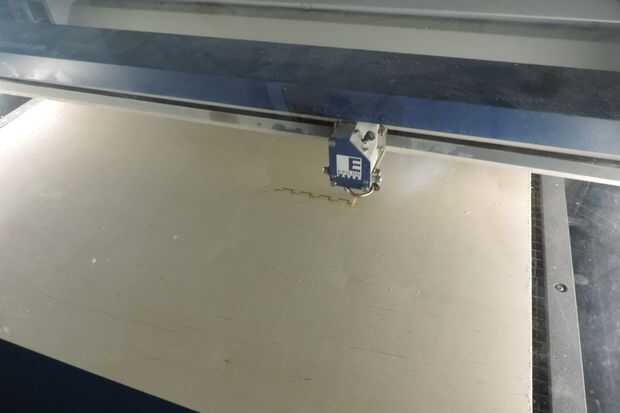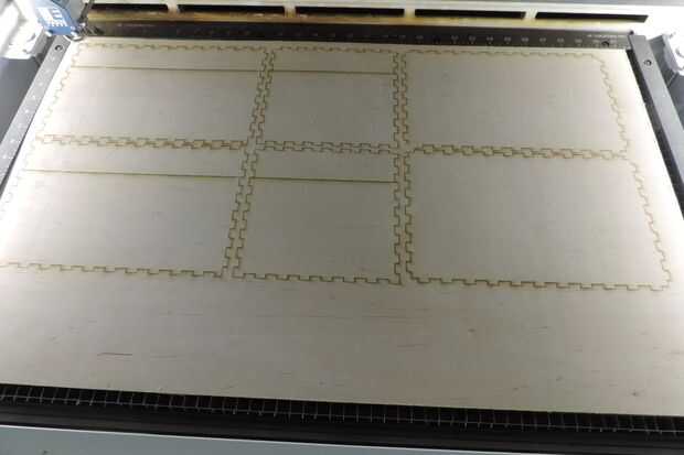 Después de han enviado la información a la cortadora láser necesita presionar GO en el tablero de instrumentos de corte. Cuando todo es cortar, poner el pedazo restante de madera o de cartón a un lado para otras partes del caso. Sigo cerca de la cuchilla como se mueve en su manera peculiar pero precisa hasta que es terminado por razones seguridad.