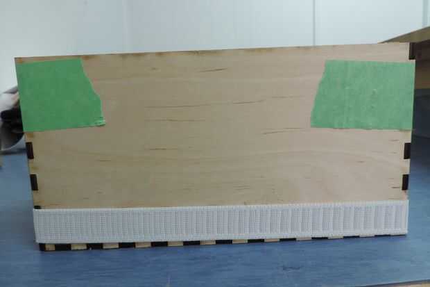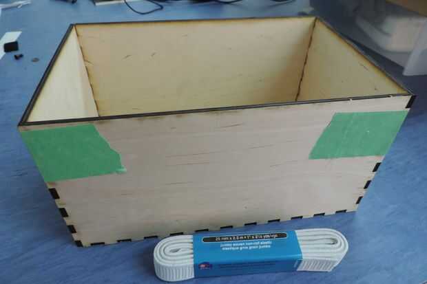 Otra vez, levante los lados en lugar de un lado a la vez. Después de tener los dos lados adyacentes en el lugar, aplique cinta de al tirar de la esquina firmemente como se aplica a las dos piezas. Continuar levantando los lados hasta que todos estén en su lugar y grabado. En este punto si tiene abrazaderas en lugar ahora, pero fallando la disponibilidad de las pinzas, utilice cualquier material que mantiene las piezas juntas. Usted puede incluso utilizar elástico interno en la sección de costura. Ejecutar el elástico alrededor del borde inferior tirando firmemente y asegúrela. Repita este proceso para la tapa.