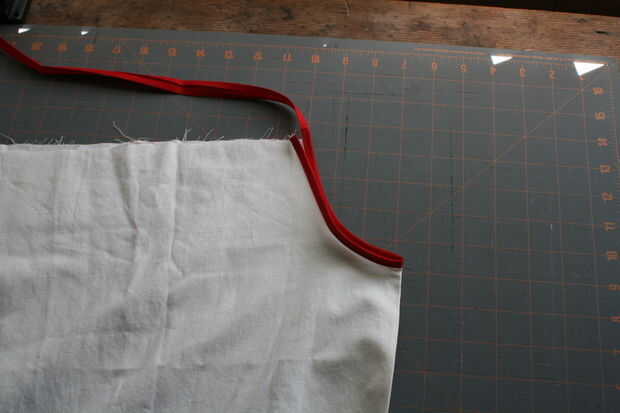 Abra la funda de almohada y poner la tendencia abierta en la parte superior de la costura de brazo bajo la tela (dentro de la ropa). Doblar sobre el borde de la tela para que la tela es en medio de los dos pliegues de sesgo. PIN si es necesario... No, pero a veces con el sesgo de 1/2 pulgada ayuda. Coser a lo largo de la costura de todo el brazo (de frente, entonces bajo la axila parte, que en la parte posterior) de ambos lados así que cuando termines, tu ropa se ve así: