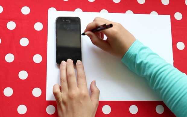 Llamar por teléfono con el lápiz y cortar la forma. Poner dentro de la caja y dibuja alrededor del orificio de la cámara. luego recórtalo utilizando el cuchillo x-acto.