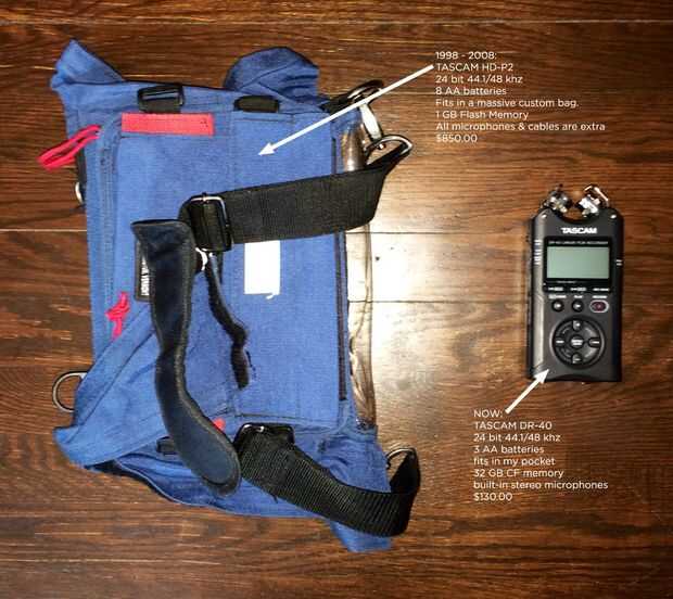 La razón más grande por que hacer este paso es debido a la foto de arriba. Me quedé mirando la comparación del tamaño de mi antigua grabadora de audio comparado con mi nuevo. El nuevo es tan maldita sea pequeño. De hecho, hasta que le puse mis dos sonido grabadoras de lado a lado no me di cuenta que un antiguo se había convertido en mi vieja grabadora digital. Dos horas después de tomar esta foto estaba vendiendo mi viejo Tascam HD-P2 en eBay. He hecho ese tipo de decisión con cada pedacito de mi equipo.