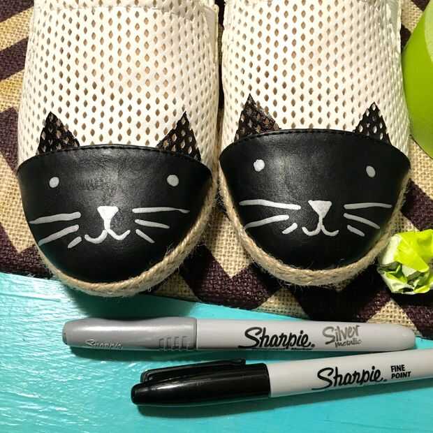usé una máquina de metal plata para dibujar las caras del gato. Yo practicaba antes de realmente se basó en el zapato.