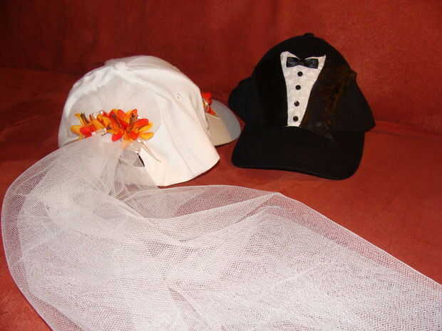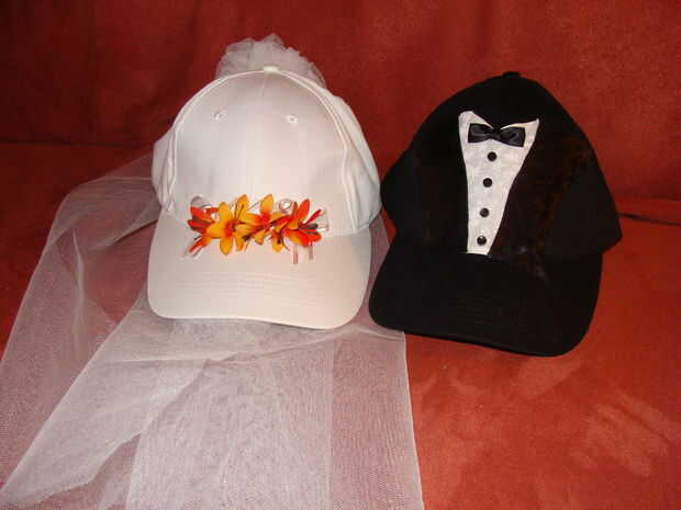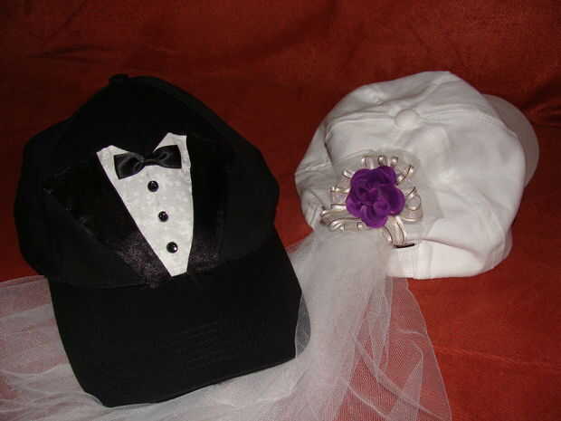 Las tapas fueron compradas en una tienda de hobby local. Usé tuele, flores de seda y cinta para hacer el sombrero de la novia. Todo es mano cosida a la cap. Tapas del novio fueron creados con material blanco, cinta negra, botones pequeños y arcos de la sección de muñecas en la tienda de hobby. Algunos de los elementos en los casquillos del novio se pegan en el, pero casi todo es reforzado con la costura de la mano.