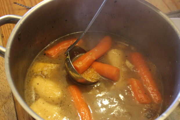 Un buen caldo casero rico! Esta es una de las partes más importantes de la cassoulet, que sin él no se obtendrá la profundidad de sabor. Generalmente hago jamón hervido y asado vino del Rin y luego mantener parte del jamón y todo el stock restante hacer un cassoulet. De esta manera llego el nutriente óptimo y del sabor de la carne y las verduras en el guiso original.