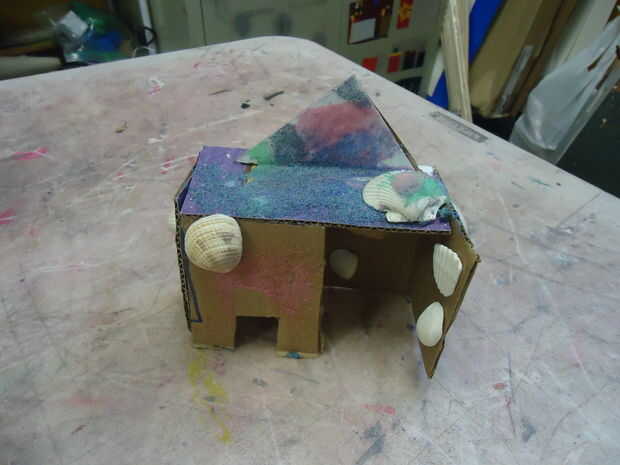 He utilizado trozos de cartón que pegan. Luego pinté el pegamento en los diferentes colores exteriores y espolvoreados de arena para hacer que las paredes parezcan arena. Luego tuve un voluntario me ayude caliente pegamento conchas alrededor del exterior.