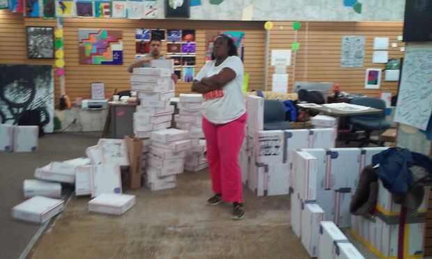 * Lala posin' con la montaña de cajas