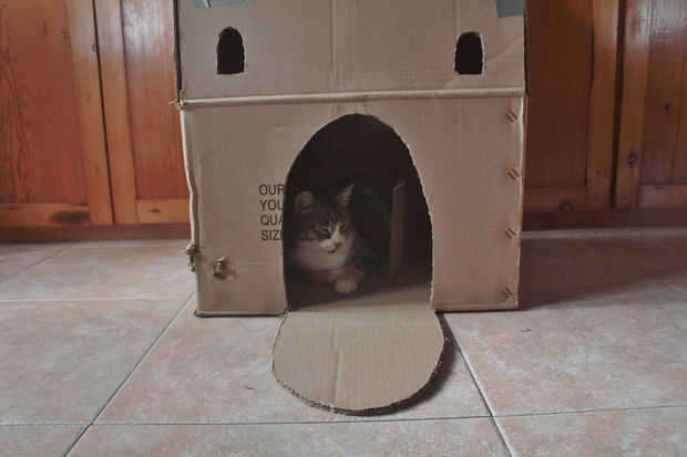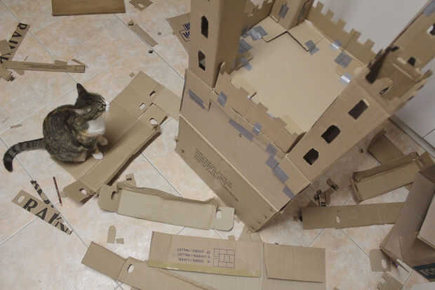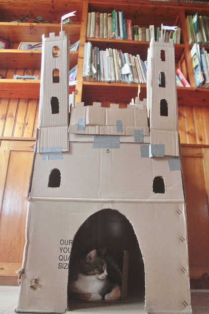 He comprado una casa de gato para poner en mi jardín para mi gatito Enya de una en línea tienda europea. Vino con dos cajas grandes.Hoy llovía (... otra vez...), así que Enya no podía salir en el jardín: me decidí a hacerla un "Castillo de gato"